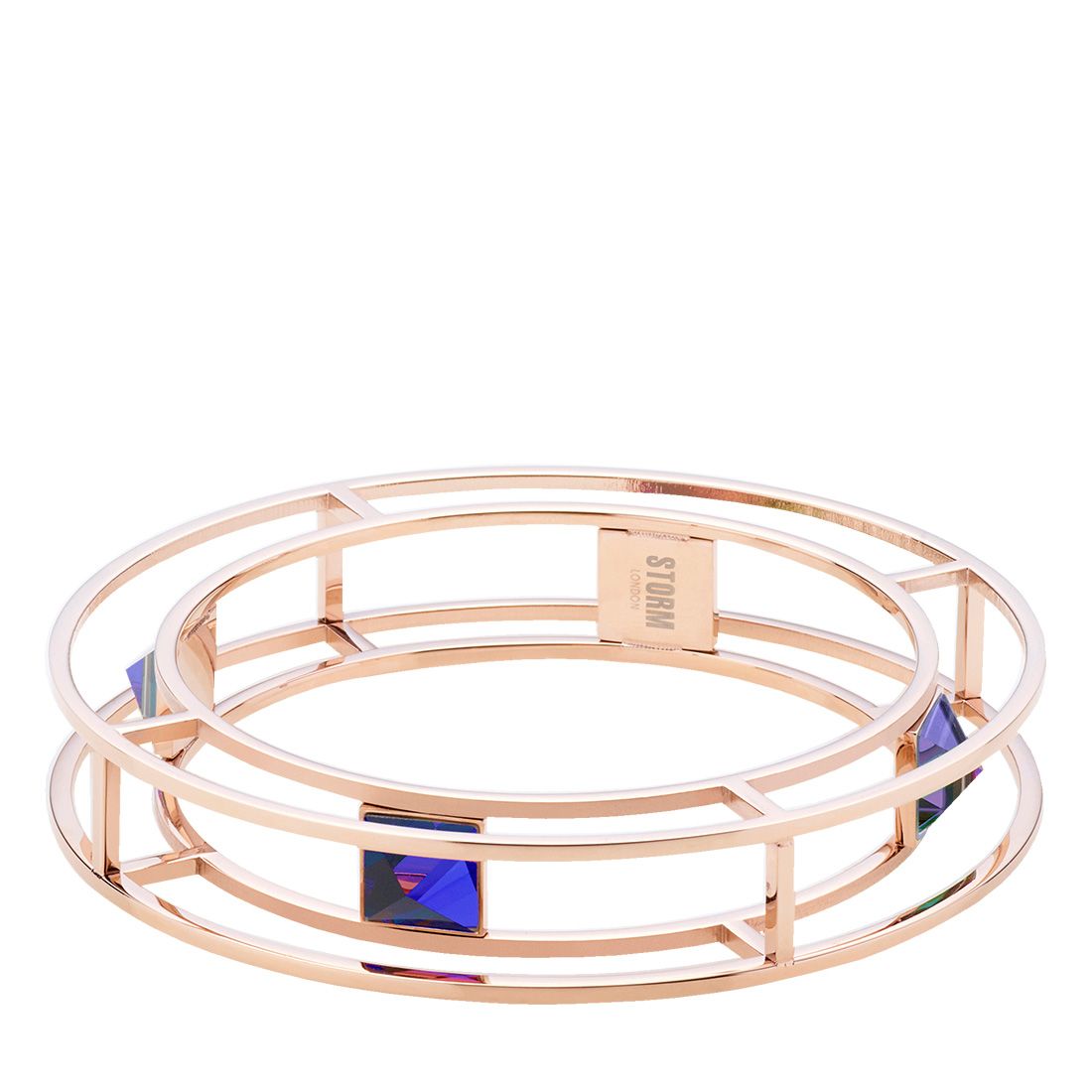 The unique STORM Gemza bangle is made from highly polished stainless steel with lazer glass pyramid stones. Available in purple/rose gold, blue/rose gold and ice/silver.