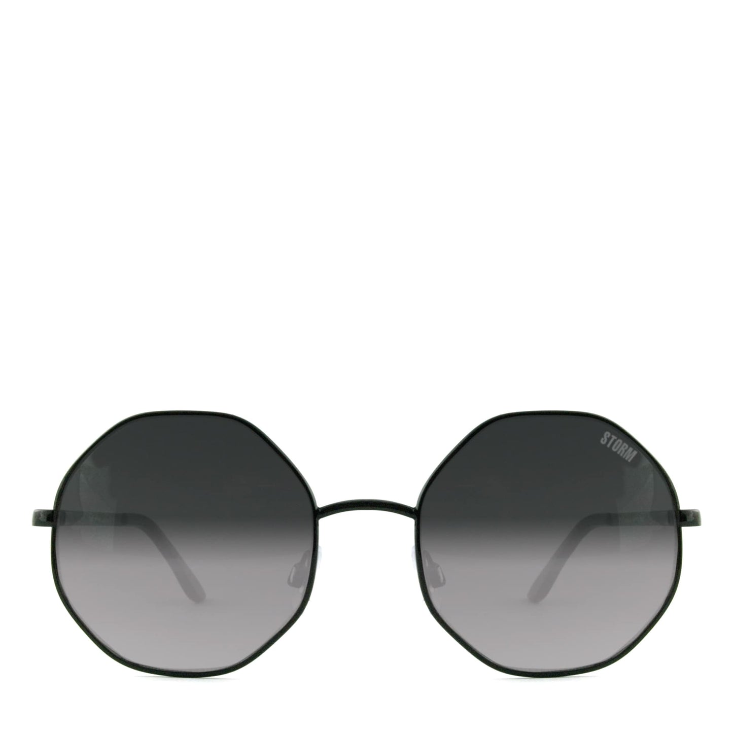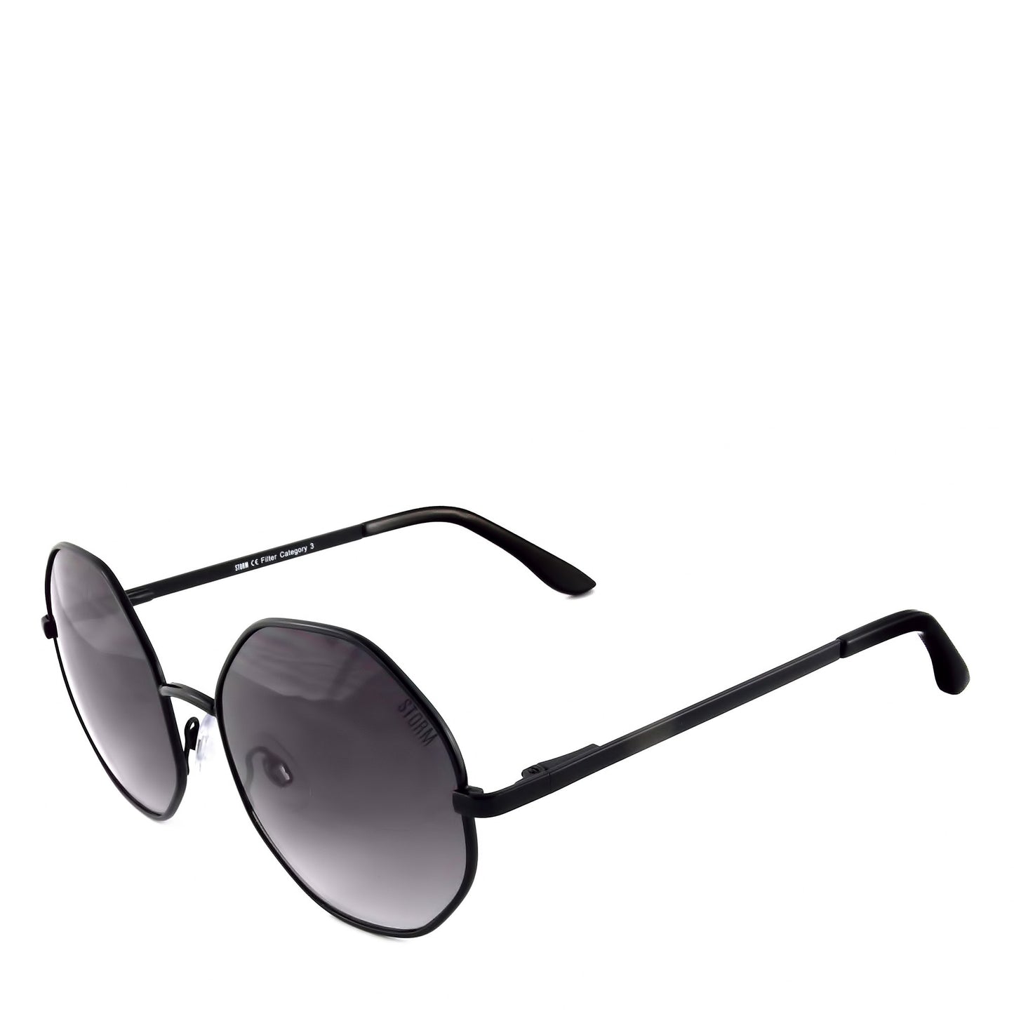 STORM fashion black metal hexagon with smoke lens. Filter category 3 offering maximum UVA/UVB protection. Supplied in a STORM branded black microfiber drawstring pouch.