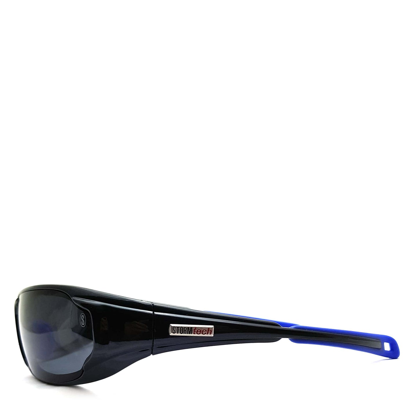 Stormtech black frame with contrast blue tips. Silver logo plate and polarised lens. Filter category 3 offering maximum UVA/UVB protection. Supplied in a Stormtech branded black microfibre drawstring pouch which doubles as a lens cleaner.