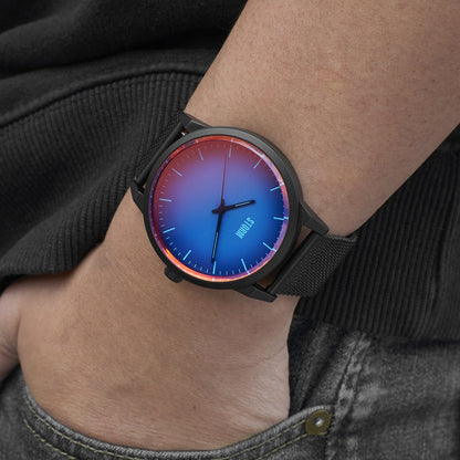 The STORM Styro is a classic looking watch with a modern twist. A stunning graduated dial in a range of intense colours features Photochromic glass. This technique stems from our laser glass technology and enables the dials to change colour at under different lighting. Styro is water resistant to 50m and features a thick mesh band made from matt black stainless steel.